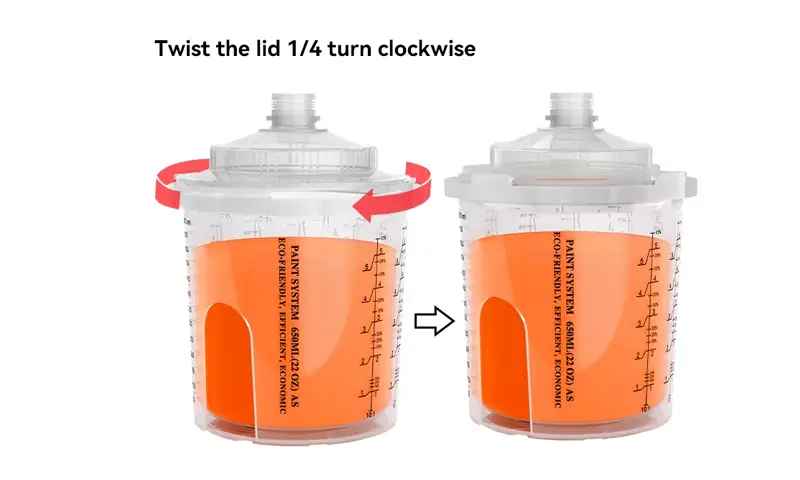 Бір рет қолданылатын бояу стакан жүйесінің құрамдас бөліктерін жинаңыз: қақпағы, лайнер, қатты кесе және стопор